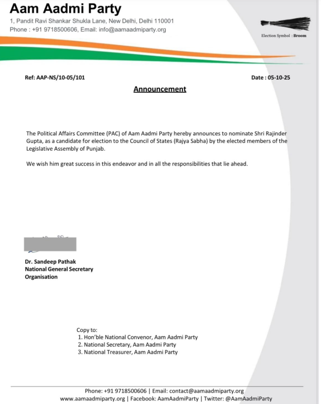 ਦੱਸ ਦਈਏ ਕਿ ਸੰਜੀਵ ਅਰੋੜਾ ਦੇ ਲੁਧਿਆਣਾ ਪੱਛਮੀ ਤੋਂ ਵਿਧਾਇਕ ਚੁਣੇ ਜਾਣ ਤੋਂ ਬਾਅਦ ਰਾਜ ਸਭਾ ਦੀ ਸੀਟ ਖ਼ਾਲੀ ਪਈ ਸੀ।ਬੀਤੇ ਦਿਨੀਂ ਰਜਿੰਦਰ ਗੁਪਤਾ ਵਲੋਂ ਪੰਜਾਬ ਯੋਜਨਾ ਬੋਰਡ ਦੇ ਵਾਈਸ ਚੇਅਰਮੈਨ ਅਤੇ ਸ਼੍ਰੀ ਕਾਲੀ ਮਾਤਾ ਮੰਦਰ ਪਟਿਆਲਾ ਦੀ ਪ੍ਰਬੰਧਕ ਕਮੇਟੀ ਦੇ ਚੇਅਰਮੈਨ ਦੇ ਅਹੁਦਿਆਂ ਤੋਂ ਅਸਤੀਫ਼ਾ ਦੇ ਦਿੱਤਾ ਗਿਆ ਸੀ ਜਿਸ ਨੂੰ ਮਨਜ਼ੂਰ ਵੀ ਕਰ ਲਿਆ ਗਿਆ।ਜ਼ਿਕਰਯੋਗ ਹੈ ਕਿ ਸੂਬੇ ਦੀਆਂ 117 ਵਿੱਚੋਂ 93 ਵਿਧਾਇਕ ਆਮ ਆਦਮੀ ਪਾਰਟੀ ਦੇ ਹਨ। ਇਹ ਚੋਣ 24 ਅਕਤੂਬਰ ਨੂੰ ਹੋਣੀ ਹੈ ਜਿਸ ਵਿਚ ਆਮ ਆਦਮੀ ਪਾਰਟੀ ਦੇ ਉਮੀਦਵਾਰ ਦੀ ਜਿੱਤ ਨਿਸ਼ਚਿਤ ਹੈ। ਸ਼ੁਰੂ ਵਿੱਚ ਚਰਚਾ ਸੀ ਕਿ ਅਰਵਿੰਦ ਕੇਜਰੀਵਾਲ ਖੁਦ ਰਾਜ ਸਭਾ ਚੋਣ ਲੜਨਗੇ। ਇਸ ਤੋਂ ਬਾਅਦ ਮਨੀਸ਼ ਸਿਸੋਦੀਆ ਦਾ ਨਾਮ ਸਾਹਮਣੇ ਆਇਆ। ਹਾਲਾਂਕਿ, ਜਦੋਂ ਵਿਰੋਧੀ ਪਾਰਟੀਆਂ ਨੇ ਦਿੱਲੀ ਵਾਸੀਆਂ ਦੇ ਪੰਜਾਬ ਰਾਜ ਸਭਾ ਸੀਟ ਤੋਂ ਚੋਣ ਲੜਨ ਦਾ ਮੁੱਦਾ ਉਠਾਇਆ ਤਾਂ ਟ੍ਰਾਈਡੈਂਟ ਦੇ ਮਾਲਕ ਰਾਜਿੰਦਰ ਗੁਪਤਾ ਦਾ ਨਾਮ ਸੁਰਖੀਆਂ ਵਿੱਚ ਆਇਆ ਅਤੇ ਆਪ ਨੇ ਉਨ੍ਹਾਂ ਦੇ ਨਾਮ ‘ਤੇ ਮੋਹਰ ਲਾ ਦਿੱਤੀ ਹੈ।