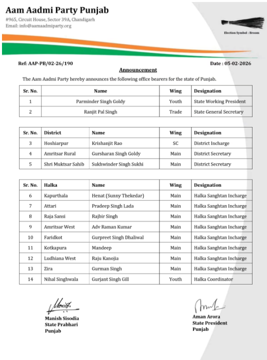 ਚੰਡੀਗੜ੍ਹ: ਆਮ ਆਦਮੀ ਪਾਰਟੀ ਪੰਜਾਬ ਨੇ ਆਪਣੇ ਸੰਗਠਨਾਤਮਕ ਢਾਂਚੇ ਦਾ ਐਲਾਨ ਕੀਤਾ ਹੈ। ਪਰਮਿੰਦਰ ਸਿੰਘ ਗੋਲਡੀ ਨੂੰ ਯੂਥ ਵਿੰਗ ਦਾ ਕਾਰਜਕਾਰੀ ਪ੍ਰਧਾਨ ਨਿਯੁਕਤ ਕੀਤਾ ਗਿਆ ਹੈ।