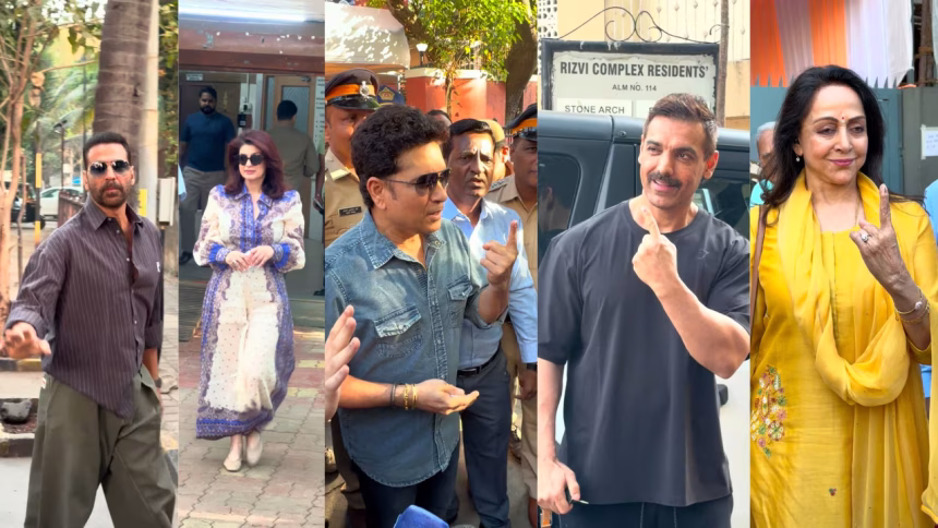 ਇਸ ਮੌਕੇ ‘ਤੇ ਬਾਲੀਵੁੱਡ ਸੈਲੇਬ੍ਰਿਟੀ ਵੀ ਆਪਣੀ ਵੋਟ ਪਾਉਣ ਲਈ ਪੋਲਿੰਗ ਸਟੇਸ਼ਨਾਂ ‘ਤੇ ਪਹੁੰਚ ਰਹੇ ਹਨ। ਅਦਾਕਾਰ ਅਕਸ਼ੈ ਕੁਮਾਰ ਆਪਣੀ ਪਤਨੀ ਟਵਿੰਕਲ ਖੰਨਾ ਨਾਲ ਵੋਟ ਪਾਉਣ ਲਈ ਪੋਲਿੰਗ ਬੂਥ ‘ਤੇ ਪਹੁੰਚੇ। ਜੌਨ ਅਬ੍ਰਾਹਮ, ਸੁਨੀਲ ਸ਼ੈੱਟੀ, ਰਾਕੇਸ਼ ਰੋਸ਼ਨ, ਗੁਲਜ਼ਾਰ, ਹੇਮਾ ਮਾਲਿਨੀ, ਤਮੰਨਾ ਭਾਟੀਆ, ਜੁਨੈਦ ਖਾਨ ਅਤੇ ਕਿਰਨ ਰਾਓ ਵੀ ਵੋਟ ਪਾਉਣ ਲਈ ਪਹੁੰਚੇ।