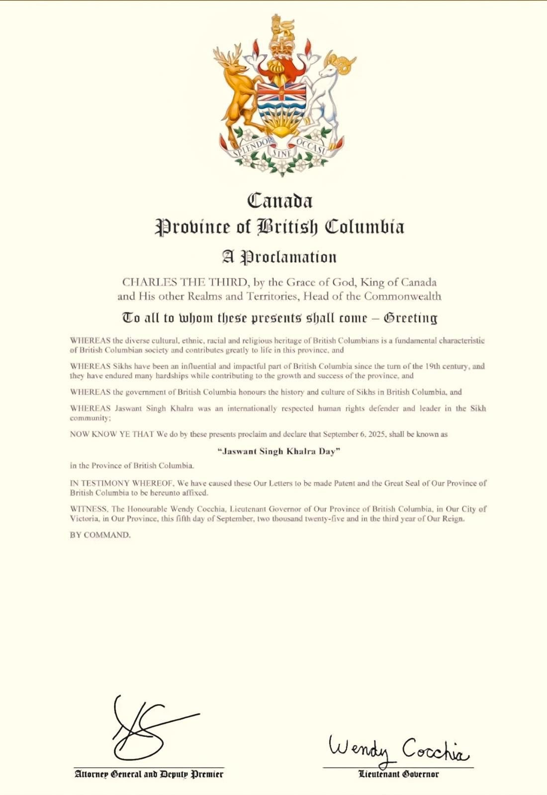 ਬ੍ਰਿਟਿਸ਼ ਕੋਲੰਬੀਆ ਸਰਕਾਰ ਨੇ ਆਪਣੇ ਪੱਤਰ ਵਿੱਚ ਕਿਹਾ ਹੈ ਕਿ ਜਸਵੰਤ ਸਿੰਘ ਖਾਲੜਾ ਅੰਤਰਰਾਸ਼ਟਰੀ ਪੱਧਰ ‘ਤੇ ਸਤਿਕਾਰਤ ਮਾਨਵ ਅਧਿਕਾਰ ਰੱਖਿਅਕ ਸਨ, ਅਤੇ ਉਹਨਾਂ ਦੀ ਯਾਦ ਨੂੰ ਸਦਾ ਜਿਉਂਦਾ ਰੱਖਣਾ ਬ੍ਰਿਟਿਸ਼ ਕੋਲੰਬੀਆ ਦੇ ਲੋਕਾਂ ਲਈ ਮਾਣ ਦੀ ਗੱਲ ਹੈ। ਸੂਬੇ ਦੀ ਲੈਫਟੀਨੈਂਟ ਗਵਰਨਰ ਵੈਂਡੀ ਕੋਕੀਆ ਨੇ ਇਸ ਦਸਤਾਵੇਜ਼ ‘ਤੇ ਦਸਤਖਤ ਕਰਕੇ 6 ਸਤੰਬਰ ਨੂੰ ‘ਜਸਵੰਤ ਸਿੰਘ ਖਾਲੜਾ ਦਿਵਸ’ ਐਲਾਨ ਕੀਤਾ।