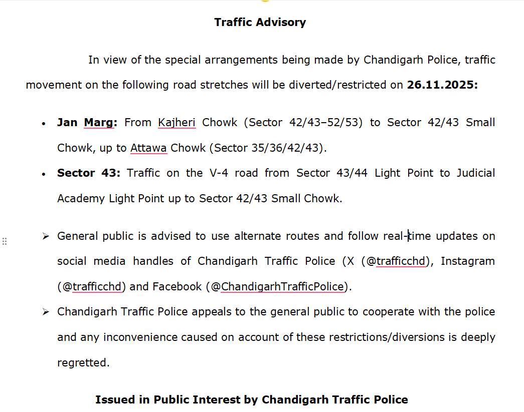 ਚੰਡੀਗੜ੍ਹ ਟ੍ਰੈਫਿਕ ਪੁਲਿਸ ਨੇ 26 ਨਵੰਬਰ, 2025 ਲਈ ਇੱਕ ਵਿਸਤ੍ਰਿਤ ਟ੍ਰੈਫਿਕ ਸਲਾਹ ਜਾਰੀ ਕੀਤੀ ਹੈ, ਜਿਸ ਵਿੱਚ ਸ਼ਹਿਰ ਭਰ ਵਿੱਚ ਕਈ ਪਾਬੰਦੀਆਂ ਦੀ ਰੂਪਰੇਖਾ ਦਿੱਤੀ ਗਈ ਹੈ। ਇਹ ਜਾਣਕਾਰੀ ਵਿਭਾਗ ਦੇ ਅਧਿਕਾਰਤ X (ਪਹਿਲਾਂ ਟਵਿੱਟਰ) ਹੈਂਡਲ ‘ਤੇ ਸਾਂਝੀ ਕੀਤੀ ਗਈ ਹੈ। ਇਹ ਟਰੈਫਿਕ ਐਡਵਾਇਜ਼ਰੀ “ਵਿਸ਼ੇਸ਼ ਪ੍ਰਬੰਧਾਂ ਦੇ ਮੱਦੇਨਜ਼ਰ” ਜਾਰੀ ਕੀਤੀ ਗਈ ਹੈ ਅਤੇ ਯਾਤਰੀਆਂ ਨੂੰ ਟ੍ਰੈਫਿਕ ਜਾਮ ਤੋਂ ਬਚਣ ਲਈ ਨਿਰਧਾਰਤ ਡਾਇਵਰਸ਼ਨ ਰੂਟਾਂ ਦੀ ਪਾਲਣਾ ਕਰਨ ਦੀ ਬੇਨਤੀ ਕੀਤੀ ਗਈ ਹੈ।