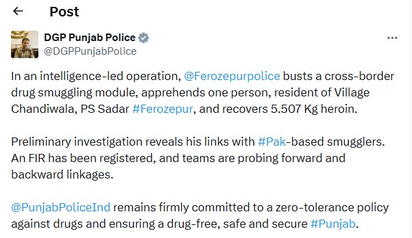 ਇਸ ਮਹੱਤਵਪੂਰਨ ਸਫਲਤਾ ਬਾਰੇ ਜਾਣਕਾਰੀ ਪੰਜਾਬ ਦੇ ਡੀਜੀਪੀ ਗੌਰਵ ਯਾਦਵ ਨੇ ਆਪਣੇ ਸੋਸ਼ਲ ਮੀਡੀਆ ਪਲੇਟਫਾਰਮ ‘ਐਕਸ’ ‘ਤੇ ਸਾਂਝੀ ਕੀਤੀ। ਉਨ੍ਹਾਂ ਲਿਖਿਆ ਕਿ “ਫਿਰੋਜ਼ਪੁਰ ਪੁਲਿਸ ਵੱਲੋਂ ਖੁਫੀਆ ਜਾਣਕਾਰੀ ਤੇ ਕਾਰਵਾਈ ਕਰਦੇ ਹੋਏ, ਸਰਹੱਦ ਪਾਰ ਨਸ਼ਾ ਤਸਕਰੀ ਨਾਲ ਜੁੜੇ ਇੱਕ ਮਾਡਿਊਲ ਦਾ ਪਰਦਾਫਾਸ਼ ਕਰਕੇ, ਫਿਰੋਜ਼ਪੁਰ ਦੇ ਥਾਣਾ ਸਦਰ ਦੇ ਪਿੰਡ ਚਾਂਦੀਵਾਲਾ ਦੇ ਰਹਿਣ ਵਾਲੇ ਮਨਜੀਤ ਸਿੰਘ ਨੂੰ ਗ੍ਰਿਫ਼ਤਾਰ ਕੀਤਾ ਗਿਆ ਹੈ ਅਤੇ ਕਰਕੇ ਉਸਦੇ ਕਬਜ਼ੇ ਵਿਚੋਂ 5.507 ਕਿਲੋ ਹੈਰੋਇਨ ਬਰਾਮਦ ਕੀਤੀ ਗਈ ਹੈ। ਮੁੱਢਲੀ ਜਾਂਚ ਵਿੱਚ ਉਸ ਦੇ ਪਾਕਿਸਤਾਨ-ਅਧਾਰਤ ਤਸਕਰਾਂ ਨਾਲ ਸਬੰਧਾਂ ਦਾ ਖੁਲਾਸਾ ਹੋਇਆ ਹੈ। ਮਾਮਲੇ ਸਬੰਧੀ ਐਫ.ਆਈ.ਆਰ. ਦਰਜ ਕੀਤੀ ਗਈ ਹੈ, ਅਤੇ ਅਗਲੇ ਅਤੇ ਪਿਛਲੇ ਸਬੰਧਾਂ ਦਾ ਪਤਾ ਕਰਨ ਲਈ ਅਗਲੇਰੀ ਜਾਂਚ ਜਾਰੀ ਹੈ।”