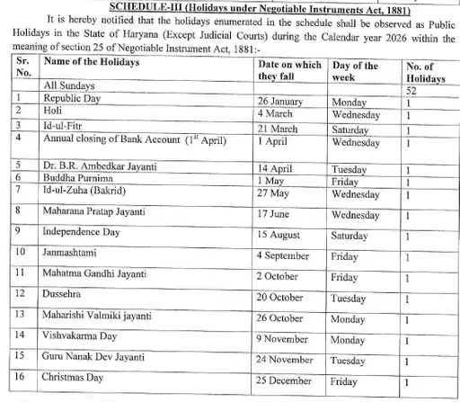 ਇਸ ਤੋਂ ਇਲਾਵਾ ਸਰਕਾਰ ਨੇ 2026 ਲਈ ਨੈਗੋਸ਼ੀਏਬਲ ਇੰਸਟਰੂਮੈਂਟਸ ਐਕਟ, 1881 ਦੇ ਤਹਿਤ ਲਾਗੂ ਜਨਤਕ ਛੁੱਟੀਆਂ ਦੀ ਸੂਚੀ ਵੀ ਜਾਰੀ ਕੀਤੀ ਹੈ। ਇਹ ਛੁੱਟੀਆਂ ਹਰਿਆਣਾ ਰਾਜ ਵਿੱਚ ਲਾਗੂ ਹੋਣਗੀਆਂ (ਨਿਆਂਇਕ ਅਦਾਲਤਾਂ ਨੂੰ ਛੱਡ ਕੇ) ਅਤੇ ਐਕਟ ਦੀ ਧਾਰਾ 25 ਦੇ ਤਹਿਤ ਵਿਚਾਰੀਆਂ ਜਾਣਗੀਆਂ। ਸਰਕਾਰ ਦੇ ਛੁੱਟੀਆਂ ਦੇ ਕੈਲੰਡਰ ਦੇ ਤਹਿਤ 21 ਮੌਕਿਆਂ ਨੂੰ “ਵਿਸ਼ੇਸ਼ ਦਿਨ” ਘੋਸ਼ਿਤ ਕੀਤਾ ਗਿਆ ਹੈ। ਇਨ੍ਹਾਂ ਸਾਰੀਆਂ ਤਾਰੀਖਾਂ ‘ਤੇ ਕੋਈ ਜਨਤਕ ਛੁੱਟੀ ਨਹੀਂ ਹੋਵੇਗੀ, ਅਤੇ ਸਰਕਾਰੀ ਦਫ਼ਤਰ ਆਮ ਵਾਂਗ ਖੁੱਲ੍ਹੇ ਰਹਿਣਗੇ।