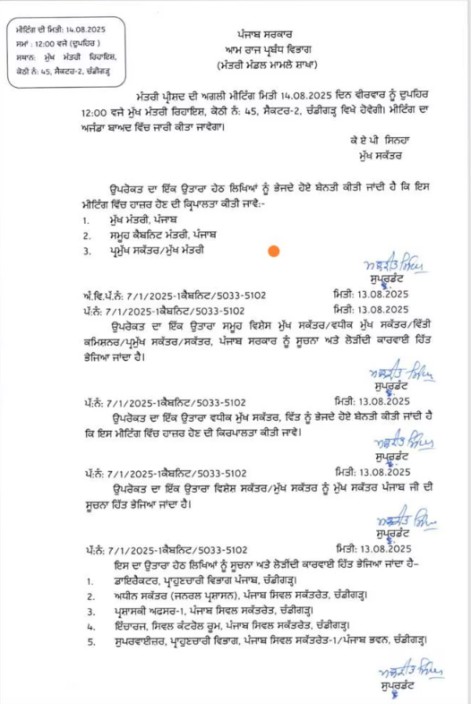 ਚੰਡੀਗੜ੍ਹ: ਪੰਜਾਬ ਦੇ ਮੁੱਖ ਮੰਤਰੀ ਭਗਵੰਤ ਮਾਨ ਵੱਲੋਂ ਭਲਕੇ ਪੰਜਾਬ ਕੈਬਨਿਟ ਦੀ ਅਹਿਮ ਬੈਠਕ ਸੱਦੀ ਗਈ ਹੈ।  CM ਮਾਨ   ਦੀ ਅਗਵਾਈ ਵਾਲੀ ਕੈਬਨਿਟ ਮੀਟਿੰਗ 14 ਅਗਸਤ ਵੀਰਵਾਰ ਨੂੰ ਹੋਵੇਗੀ। ਇਹ ਮੀਟਿੰਗ ਮੁੱਖ ਮੰਤਰੀ ਮਾਨ ਦੀ ਰਿਹਾਇਸ਼ ‘ਤੇ ਦੁਪਹਿਰ 12 ਵਜੇ ਹੋਵੇਗੀ।ਮੀਟਿੰਗ ਵਿੱਚ ਕਈ ਅਹਿਮ ਫ਼ੈਸਲੇ ਹੋ ਸਕਦੇ ਹਨ।
