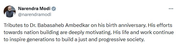 ਪੀ ਐਮ ਮੋਦੀ ਨੇ ਟਵੀਟ ਕੀਤਾ ਕਿ “ਡਾ. ਬਾਬਾ ਸਾਹਿਬ ਅੰਬੇਡਕਰ ਦੀ ਜਯੰਤੀ ‘ਤੇ ਉਨ੍ਹਾਂ ਨੂੰ ਨਿਮਰ ਸ਼ਰਧਾਂਜਲੀ। ਰਾਸ਼ਟਰ ਨਿਰਮਾਣ ਦੀ ਦਿਸ਼ਾ ਵਿੱਚ ਉਨ੍ਹਾਂ ਦੇ ਯਤਨ ਬਹੁਤ ਹੀ ਪ੍ਰੇਰਨਾਦਾਇਕ ਹਨ। ਉਨ੍ਹਾਂ ਦਾ ਜੀਵਨ ਅਤੇ ਕਾਰਜ ਇੱਕ ਨਿਆਂਪੂਰਨ ਅਤੇ ਅਗਾਂਹਵਧੂ ਸਮਾਜ ਦੀ ਸਿਰਜਣਾ ਲਈ ਪੀੜ੍ਹੀਆਂ ਨੂੰ ਪ੍ਰੇਰਿਤ ਕਰਦੇ ਰਹਿਣਗੇ।