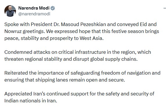ਪੀਐਮ ਮੋਦੀ ਦੀ ਪੋਸਟ ਵਿੱਚ ਕਿਹਾ ਗਿਆ, “ਰਾਸ਼ਟਰਪਤੀ ਡਾ. ਮਸੂਦ ਪੇਜ਼ੇਸ਼ਕੀਅਨ ਨਾਲ ਗੱਲਬਾਤ ਕੀਤੀ ਅਤੇ ਉਨ੍ਹਾਂ ਨੂੰ ਈਦ ਤੇ ਨਵਰੋਜ਼ ਦੀਆਂ ਸ਼ੁਭਕਾਮਨਾਵਾਂ ਦਿੱਤੀਆਂ। ਅਸੀਂ ਉਮੀਦ ਜਤਾਈ ਕਿ ਤਿਉਹਾਰਾਂ ਦਾ ਇਹ ਸੀਜ਼ਨ ਪੱਛਮੀ ਏਸ਼ੀਆ ਵਿੱਚ ਸ਼ਾਂਤੀ, ਸਥਿਰਤਾ ਅਤੇ ਖੁਸ਼ਹਾਲੀ ਲਿਆਵੇਗਾ। ਖੇਤਰ ਵਿੱਚ ਅਹਿਮ ਬੁਨਿਆਦੀ ਢਾਂਚੇ ‘ਤੇ ਹੋਏ ਹਮਲਿਆਂ ਦੀ ਨਿੰਦਾ ਕੀਤੀ, ਜੋ ਖੇਤਰੀ ਸਥਿਰਤਾ ਨੂੰ ਖ਼ਤਰੇ ਵਿੱਚ ਪਾਉਂਦੇ ਹਨ ਅਤੇ ਵਿਸ਼ਵਵਿਆਪੀ ਸਪਲਾਈ ਚੇਨ ਨੂੰ ਪ੍ਰਭਾਵਿਤ ਕਰਦੇ ਹਨ। ਨੇਵੀਗੇਸ਼ਨ ਦੀ ਆਜ਼ਾਦੀ ਦੀ ਰੱਖਿਆ ਕਰਨ ਅਤੇ ਸ਼ਿਪਿੰਗ ਮਾਰਗਾਂ ਨੂੰ ਖੁੱਲ੍ਹਾ ਤੇ ਸੁਰੱਖਿਅਤ ਰੱਖਣ ਦੇ ਮਹੱਤਵ ਨੂੰ ਦੁਹਰਾਇਆ। ਈਰਾਨ ਵਿੱਚ ਭਾਰਤੀ ਨਾਗਰਿਕਾਂ ਦੀ ਸੁਰੱਖਿਆ ਲਈ ਈਰਾਨ ਦੇ ਨਿਰੰਤਰ ਸਹਿਯੋਗ ਦੀ ਸ਼ਲਾਘਾ ਕੀਤੀ।”