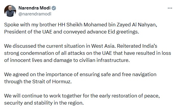 ਜ਼ਿਕਰਯੋਗ ਹੈ ਕਿ ਗੱਲਬਾਤ ਤੋਂ ਬਾਅਦ ਪ੍ਰਧਾਨ ਮੰਤਰੀ ਮੋਦੀ ਨੇ ਟਵੀਟ ਕੀਤਾ “ਮੈਂ ਸੰਯੁਕਤ ਅਰਬ ਅਮੀਰਾਤ ਦੇ ਰਾਸ਼ਟਰਪਤੀ ਸ਼ੇਖ ਮੁਹੰਮਦ ਬਿਨ ਜਾਇਦ ਅਲ ਨਾਹਯਾਨ ਨਾਲ ਗੱਲਬਾਤ ਕੀਤੀ ਅਤੇ ਈਦ ਦੀਆਂ ਪਹਿਲਾਂ ਹੀ ਮੁਬਾਰਕਾਂ ਦਿੱਤੀਆਂ। ਅਸੀਂ ਪੱਛਮੀ ਏਸ਼ੀਆ ਦੀ ਮੌਜੂਦਾ ਸਥਿਤੀ ‘ਤੇ ਚਰਚਾ ਕੀਤੀ। ਅਸੀਂ ਯੂਏਈ ‘ਤੇ ਹਾਲ ਹੀ ਵਿੱਚ ਹੋਏ ਹਮਲਿਆਂ ਦੀ ਵੀ ਸਖ਼ਤ ਨਿੰਦਾ ਕੀਤੀ, ਜਿਸ ਵਿੱਚ ਬਹੁਤ ਸਾਰੇ ਮਾਸੂਮ ਲੋਕਾਂ ਦੀ ਜਾਨ ਗਈ ਅਤੇ ਨਾਗਰਿਕ ਬੁਨਿਆਦੀ ਢਾਂਚੇ ਨੂੰ ਨੁਕਸਾਨ ਪਹੁੰਚਿਆ।”