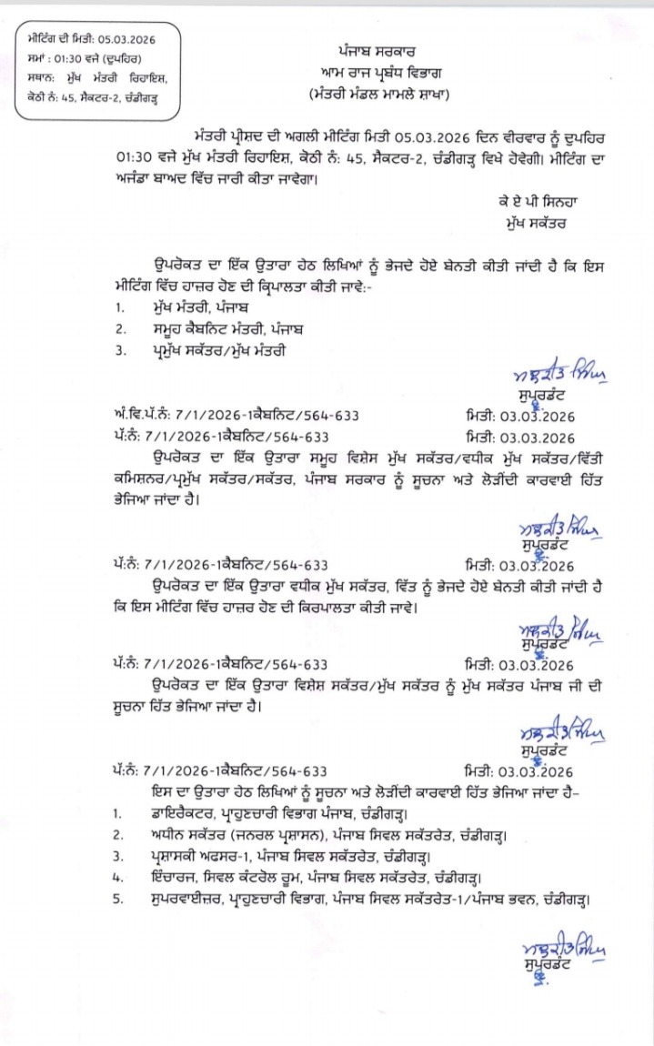 ਚੰਡੀਗੜ੍ਹ : ਪੰਜਾਬ ਕੈਬਨਿਟ ਦੀ ਅੱਜ ਹੋਣ ਵਾਲੀ ਮੀਟਿੰਗ ਕਿਸੇ ਕਾਰਨ ਮੁਲਤਵੀ ਹੋ ਗਈ ਹੈ। ਹੁਣ ਪੰਜਾਬ ਕੈਬਨਿਟ ਦੀ ਅਹਿਮ ਮੀਟਿੰਗ ਭਲਕੇ 6 ਮਾਰਚ ਨੂੰ ਹੋਵੇਗੀ। ਪਹਿਲਾਂ ਮੰਤਰੀ ਮੰਡਲ ਦੀ ਮੀਟਿੰਗ 5 ਮਾਰਚ 2026 (ਵੀਰਵਾਰ) ਨੂੰ ਦੁਪਹਿਰ 01:30 ਵਜੇ ਹੋਣੀ ਤੈਅ ਹੋਈ ਸੀ, ਪਰ ਹੁਣ ਇਸ ਵਿੱਚ ਤਬਦੀਲੀ ਕਰਦਿਆਂ ਨਵਾਂ ਸਮਾਂ ਨਿਰਧਾਰਿਤ ਕੀਤਾ ਗਿਆ ਹੈ। ਜਾਣਕਾਰੀ ਅਨੁਸਾਰ, ਇਹ ਕੈਬਨਿਟ ਮੀਟਿੰਗ 6 ਮਾਰਚ 2026 ਨੂੰ ਸਵੇਰੇ ਸਾਢੇ 9 ਵਜੇ ਪੰਜਾਬ ਵਿਧਾਨ ਸਭਾ ਸਕੱਤਰੇਤ ਚੰਡੀਗੜ੍ਹ ਵਿਖੇ ਹੋਵੇਗੀ।