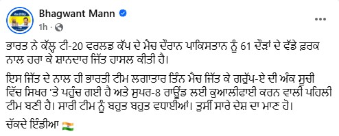 ਪੰਜਾਬ ਦੇ ਮੁੱਖ ਮੰਤਰੀ ਨੇ ਭਾਰਤੀ ਟੀਮ ਨੂੰ ਸ਼ਾਨਦਾਰ ਜਿੱਤ ਲਈ ਵਧਾਈ ਦਿੱਤੀ ਹੈ। ਉਨ੍ਹਾਂ ਟਵੀਟ ਕੀਤਾ ਕਿ ” ਭਾਰਤ ਨੇ ਕੱਲ੍ਹ ਟੀ-20 ਵਰਲਡ ਕੱਪ ਦੇ ਮੈਚ ਦੌਰਾਨ ਪਾਕਿਸਤਾਨ ਨੂੰ 61 ਦੌੜਾਂ ਦੇ ਵੱਡੇ ਫ਼ਰਕ ਨਾਲ ਹਰਾ ਕੇ ਸ਼ਾਨਦਾਰ ਜਿੱਤ ਹਾਸਲ ਕੀਤੀ ਹੈ। ਇਸ ਜਿੱਤ ਦੇ ਨਾਲ ਹੀ ਭਾਰਤੀ ਟੀਮ ਲਗਾਤਾਰ ਤਿੰਨ ਮੈਚ ਜਿੱਤ ਕੇ ਗਰੁੱਪ-ਏ ਦੀ ਅੰਕ ਸੂਚੀ ਵਿੱਚ ਸਿਖਰ ‘ਤੇ ਪਹੁੰਚ ਗਈ ਹੈ ਅਤੇ ਸੁਪਰ-8 ਰਾਊਂਡ ਲਈ ਕੁਆਲੀਫਾਈ ਕਰਨ ਵਾਲੀ ਪਹਿਲੀ ਟੀਮ ਬਣੀ ਹੈ। ਸਾਰੀ ਟੀਮ ਨੂੰ ਬਹੁਤ ਬਹੁਤ ਵਧਾਈਆਂ। ਤੁਸੀਂ ਸਾਰੇ ਦੇਸ਼ ਦਾ ਮਾਣ ਹੋ।”