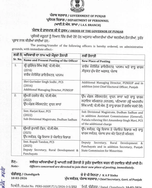ਚੰਡੀਗੜ੍ਹ – ਪੰਜਾਬ ਸਰਕਾਰ ਵੱਲੋਂ ਸੂਬੇ ਦੇ ਤਿੰਨ ਪੀਸੀਐਸ ਅਫ਼ਸਰਾਂ ਦਾ ਤਬਾਦਲਾ ਕੀਤਾ ਗਿਆ ਹੈ। ਜਿਸ ਦੀ ਸੂਚੀ ਹੇਠਾਂ ਦਿੱਤੀ ਗਈ ਹੈ