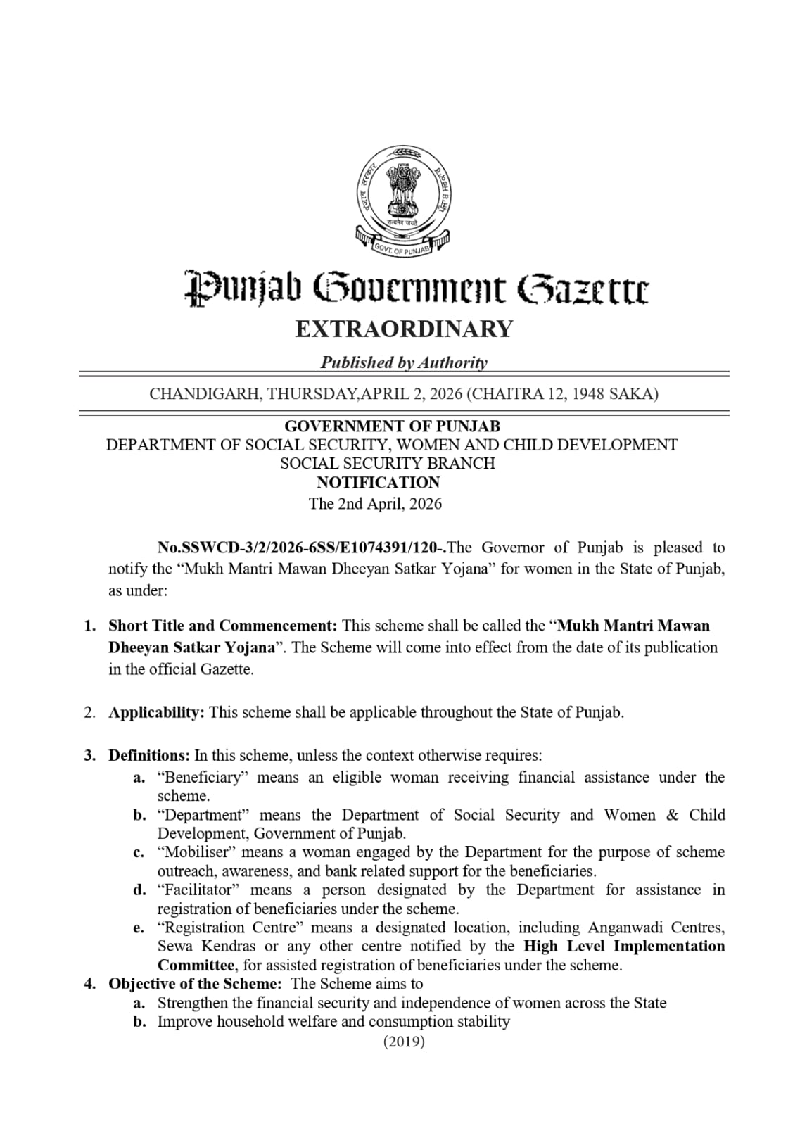 ਚੰਡੀਗੜ੍ਹ : ਪੰਜਾਬ ਸਰਕਾਰ ਨੇ ‘ਮੁੱਖ ਮੰਤਰੀ ਮਾਵਾਂ-ਧੀਆਂ ਸਤਿਕਾਰ ਯੋਜਨਾ’ ਦੀ ਨੋਟੀਫਿਕੇਸ਼ਨ ਜਾਰੀ ਕਰ ਦਿੱਤੀ ਹੈ। ਅੰਤਰਰਾਸ਼ਟਰੀ ਮਹਿਲਾ ਦਿਵਸ ਵਾਲੇ ਦਿਨ ਬਜਟ ਪੇਸ਼ ਕਰਦੇ ਸਮੇਂ ਵਿੱਤ ਮੰਤਰੀ ਹਰਪਾਲ ਸਿੰਘ ਚੀਮਾ ਨੇ ਇਸ ਅਹਿਮ ਯੋਜਨਾ ਦਾ ਐਲਾਨ ਕੀਤਾ ਸੀ। ਦੱਸ ਦਈਏ ਕਿ ਇਸ ਯੋਜਨਾ ਤਹਿਤ 18 ਸਾਲ ਤੋਂ ਵੱਧ ਉਮਰ ਦੀਆਂ ਸਾਰੀਆਂ ਔਰਤਾਂ (ਸਰਕਾਰੀ ਕਰਮਚਾਰੀਆਂ, ਸਾਬਕਾ ਵਿਧਾਇਕਾਂ, ਸੰਸਦ ਮੈਂਬਰਾਂ ਅਤੇ ਪੈਨਸ਼ਨਰਾਂ ਨੂੰ ਛੱਡ ਕੇ) ਨੂੰ ਇਸ ਯੋਜਨਾ ਦਾ ਲਾਭ ਮਿਲੇਗਾ।