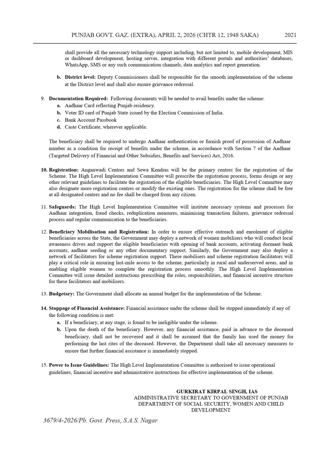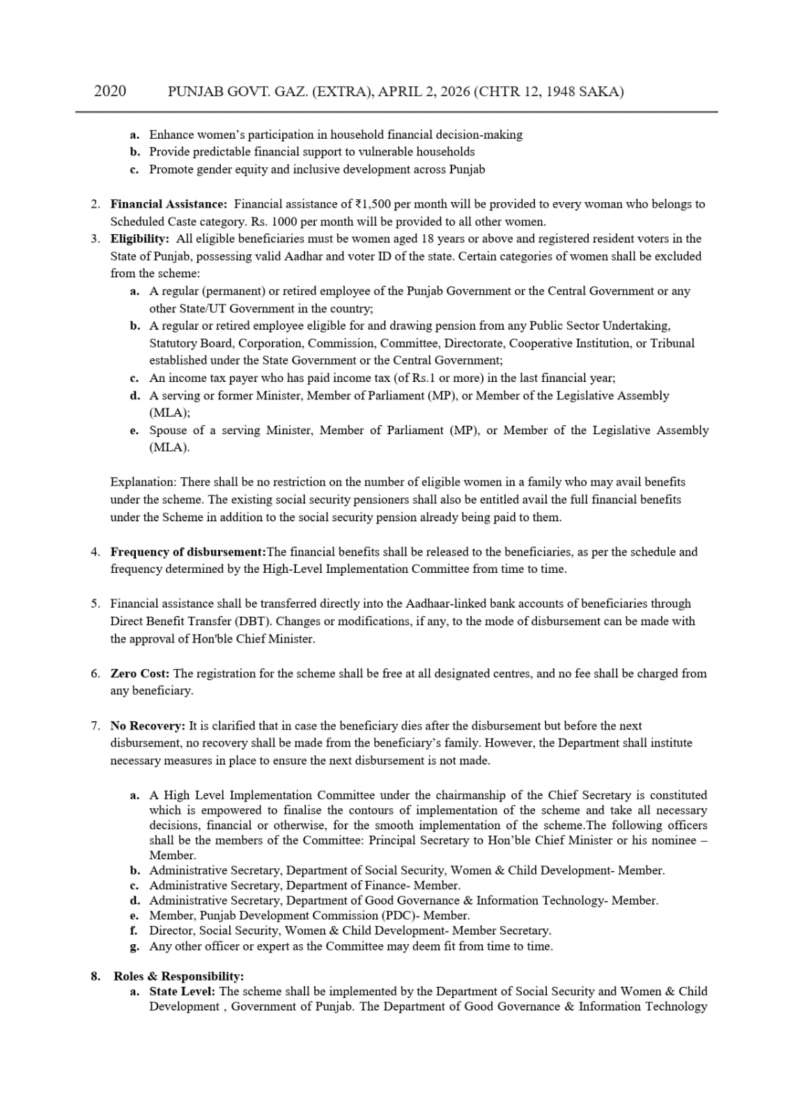 ਯੋਜਨਾ ਦੇ ਤਹਿਤ ਜਨਰਲ ਵਰਗ ਦੀਆਂ ਔਰਤਾਂ ਨੂੰ 1,100 ਰੁਪਏ ਪ੍ਰਤੀ ਮਹੀਨਾ ਅਤੇ ਅਨੁਸੂਚਿਤ ਜਾਤੀ (ਐੱਸ.ਸੀ.) ਵਰਗ ਦੀਆਂ ਔਰਤਾਂ ਨੂੰ 1,500 ਰੁਪਏ ਪ੍ਰਤੀ ਮਹੀਨਾ ਦੀ ਵਿੱਤੀ ਸਹਾਇਤਾ ਦਿੱਤੀ ਜਾਵੇਗੀ। ਨੋਟੀਫਿਕੇਸ਼ਨ ਵਿੱਚ ਸਪੱਸ਼ਟ ਕੀਤਾ ਗਿਆ ਹੈ ਕਿ ਔਰਤਾਂ ਨੂੰ ਇਸ ਯੋਜਨਾ ਦਾ ਲਾਭ 2 ਅਪ੍ਰੈਲ ਤੋਂ ਪ੍ਰਭਾਵੀ ਮੰਨਿਆ ਜਾਵੇਗਾ। ਰਜਿਸਟ੍ਰੇਸ਼ਨ ਸੇਵਾ ਕੇਂਦਰਾਂ ‘ਤੇ ਮੁਫ਼ਤ ਹੋਵੇਗੀ। ਮੁੱਖ ਮੰਤਰੀ ਭਗਵੰਤ ਮਾਨ ਨੇ ਕਿਹਾ ਕਿ ਇਹ ‘ਆਪ’ ਸਰਕਾਰ ਦੀ ਗਾਰੰਟੀ ਸੀ, ਜਿਸ ਨੂੰ ਪੂਰਾ ਕਰ ਦਿੱਤਾ ਗਿਆ ਹੈ।