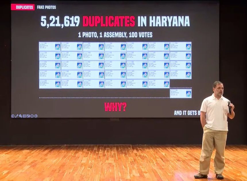ਆਪਣੀ ਕਾਨਫੰਰਸ ਵਿੱਚ ਰਾਹੁਲ ਗਾਂਧੀ ਨੇ ਹਰਿਆਣਾ ਦੀ ਵੋਟਰ ਸੂਚੀ ਦਿਖਾਈ ਅਤੇ ਕਿਹਾ ਕਿ ਬ੍ਰਾਜ਼ੀਲ ਦੀ ਇੱਕ ਮਾਡਲ ਨੇ ਹਰਿਆਣਾ ਚੋਣਾਂ ਦੌਰਾਨ 22 ਵਾਰ ਵੋਟ ਪਾਈ। ਰਾਹੁਲ ਗਾਂਧੀ ਨੇ ਉਸ ਮਾਡਲ ਦੀ ਫੋਟੋ ਦਿਖਾਈ ਤੇ ਹਰਿਆਣਾ ਦੀ ਵੋਟਰ ਸੂਚੀ ਵਿੱਚ ਇੱਕ ਬ੍ਰਾਜ਼ੀਲੀ ਔਰਤ ਦੀ ਭੂਮਿਕਾ ‘ਤੇ ਸਵਾਲ ਉਠਾਏ। ਉਨ੍ਹਾਂ ਦਾਅਵਾ ਕੀਤਾ ਕਿ ਮਾਡਲ ਨੇ 22 ਵਾਰ ਵੋਟ ਪਾਈ ਸੀ। ਉਨ੍ਹਾਂ ਦਾਅਵਾ ਕੀਤਾ ਕਿ ਹਰਿਆਣਾ ਵਿੱਚ ਪੰਜ ਸ਼੍ਰੇਣੀਆਂ ਵਿੱਚ 25 ਲੱਖ ਵੋਟਾਂ ਚੋਰੀ ਹੋ ਗਈਆਂ। ਇੱਕ ਹੋਰ ਔਰਤ ਨੇ ਇੱਕ ਵਿਧਾਨ ਸਭਾ ਹਲਕੇ ਵਿੱਚ 100 ਵਾਰ ਵੋਟ ਪਾਈ।