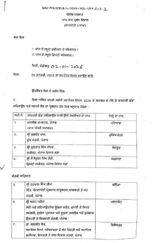ਇਸ ਦੇ ਨਾਲ ਹੀ ਦੱਸ ਦਈਏ ਕਿ ਪੰਜਾਬ ਦੇ ਮੁੱਖ ਮੰਤਰੀ ਭਗਵੰਤ ਸਿੰਘ ਮਾਨ 26 ਜਨਵਰੀ, 2026 ਨੂੰ ਹੁਸ਼ਿਆਰਪੁਰ ਵਿਖੇ ਕੌਮੀ ਝੰਡਾ ਲਹਿਰਾਉਣਗੇ ਜਦੋਂ ਕਿ ਪੰਜਾਬ ਵਿਧਾਨ ਸਭਾ ਦੇ ਸਪੀਕਰ ਕੁਲਤਾਰ ਸਿੰਘ ਸੰਧਵਾਂ ਸੰਗਰੂਰ ਤੇ ਪੰਜਾਬ ਵਿਧਾਨ ਸਭਾ ਦੇ ਡਿਪਟੀ ਸਪੀਕਰ ਜੈ ਕਿਸ਼ਨ ਰੋੜੀ ਬਰਨਾਲਾ ਵਿਖੇ ਕੌਮੀ ਝੰਡਾ ਲਹਿਰਾਉਣਗੇ।