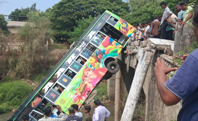 ਬੱਸ ਦੇ ਕੰਟਰੋਲ ਤੋਂ ਬਾਹਰ ਹੋ ਕੇ ਪੁਲ ਤੋਂ ਹੇਠਾਂ ਡਿੱਗਣ ਦੀ ਘਟਨਾ ਸ਼ਿਵਮੋਗਾ ਜ਼ਿਲੇ ਦੇ ਭਦਰਾਵਤੀ ਤਾਲੁਕਾ ‘ਚ ਸਥਿਤ ਵੀਰਪੁਰਾ ਪਿੰਡ ਦੇ ਕਾਗੇਹੱਲਾ ਤੋਂ ਸਾਹਮਣੇ ਆਈ ਹੈ। ਮਿਲੀ ਜਾਣਕਾਰੀ ਅਨੁਸਾਰ ਬੱਸ ਪੁਲ ਦੀ ਰੇਲਿੰਗ ਨਾਲ ਟਕਰਾ ਕੇ ਹੇਠਾਂ ਡਿੱਗ ਗਈ। ਹਾਲਾਂਕਿ ਖੁਸ਼ਕਿਸਮਤੀ ਦੀ ਗੱਲ ਇਹ ਹੈ ਕਿ ਇਸ ਹਾਦਸੇ ਵਿੱਚ ਕਿਸੇ ਵੀ ਯਾਤਰੀ ਦੀ ਜਾਨ ਨਹੀਂ ਗਈ। ਬੱਸ ਵਿੱਚ 40 ਤੋਂ ਵੱਧ ਯਾਤਰੀ ਸਵਾਰ ਸਨ। ਇਹ ਬੱਸ ਦਾਵਾਂਗੇਰੇ ਜ਼ਿਲ੍ਹੇ ਦੇ ਚੰਨਾਗਿਰੀ ਤੋਂ ਭਦਰਾਵਤੀ ਵੱਲ ਜਾ ਰਹੀ ਸੀ।