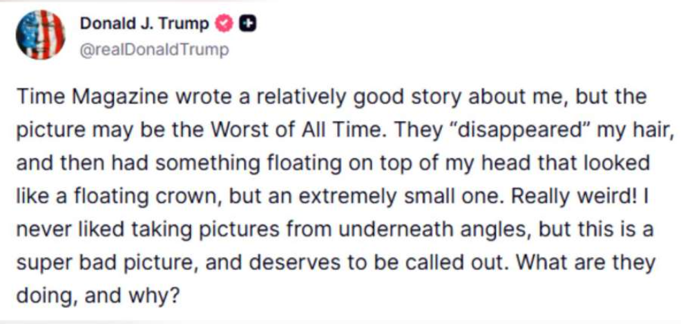 ਅਮਰੀਕੀ ਰਾਸ਼ਟਰਪਤੀ ਡੋਨਾਲਡ ਟਰੰਪ ਨੇ ਸੋਸ਼ਲ ਮੀਡੀਆ ਪਲੇਟਫਾਰਮ ਟਰੂਥ ਸੋਸ਼ਲ ‘ਤੇ ਇੱਕ ਪੋਸਟ ਵਿੱਚ ਲਿਖਿਆ ਟਾਈਮ ਮੈਗਜ਼ੀਨ ਨੇ ਮੇਰੇ ਬਾਰੇ ਇੱਕ ਵਧੀਆ ਕਹਾਣੀ ਛਾਪੀ ਹੈ, ਪਰ ਇਹ ਤਸਵੀਰ ਹੁਣ ਤੱਕ ਦੀ ਸਭ ਤੋਂ ਭੈੜੀ ਤਸਵੀਰ ਹੋ ਸਕਦੀ ਹੈ । ਉਨ੍ਹਾਂ ਨੇ ਮੇਰੇ ਵਾਲ “ਗਾਇਬ” ਕਰ ਦਿੱਤੇ, ਅਤੇ ਫਿਰ ਮੇਰੇ ਸਿਰ ਦੇ ਉੱਪਰ ਕੁਝ ਤੈਰਦਾ ਦਿਖਾਈ ਦਿੱਤਾ ਜੋ ਇੱਕ ਤੈਰਦੇ ਤਾਜ ਵਰਗਾ ਲੱਗ ਰਿਹਾ ਸੀ, ਪਰ ਬਹੁਤ ਛੋਟਾ। ਸੱਚਮੁੱਚ ਅਜੀਬ! ਮੈਨੂੰ ਕਦੇ ਵੀ ਹੇਠਾਂ ਤੋਂ ਤਸਵੀਰਾਂ ਖਿੱਚਣਾ ਪਸੰਦ ਨਹੀਂ ਆਇਆ, ਪਰ ਇਹ ਫੋਟੋ ਬਿਲਕੁਲ ਭਿਆਨਕ ਹੈ, ਅਤੇ ਇਹ ਆਲੋਚਨਾ ਦੇ ਹੱਕਦਾਰ ਹੈ। ਇਹ ਲੋਕ ਕੀ ਕਰ ਰਹੇ ਹਨ, ਅਤੇ ਕਿਉਂ?”