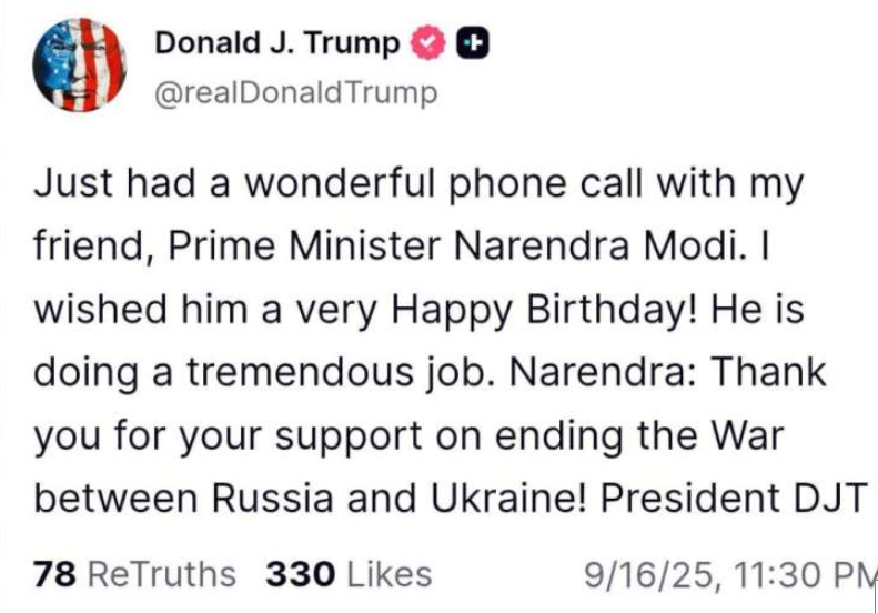 ਟਰੰਪ ਨੇ ਆਪਣੀ ਸੋਸ਼ਲ ਮੀਡੀਆ ਸਾਈਟ ਟਰੂਥ ਸੋਸ਼ਲ ‘ਤੇ ਲਿਖਿਆ, ‘ਮੇਰੀ ਆਪਣੇ ਦੋਸਤ ਪ੍ਰਧਾਨ ਮੰਤਰੀ ਨਰਿੰਦਰ ਮੋਦੀ ਨਾਲ ਫ਼ੋਨ ‘ਤੇ ਚੰਗੀ ਗੱਲਬਾਤ ਹੋਈ। ਮੈਂ ਉਨ੍ਹਾਂ ਨੂੰ ਜਨਮਦਿਨ ਦੀਆਂ ਬਹੁਤ-ਬਹੁਤ ਮੁਬਾਰਕਾਂ ਦਿੱਤੀਆਂ। ਉਹ ਬਹੁਤ ਵਧੀਆ ਕੰਮ ਕਰ ਰਹੇ ਹਨ।’ ਨਰਿੰਦਰ, ਰੂਸ-ਯੂਕਰੇਨ ਯੁੱਧ ਨੂੰ ਖਤਮ ਕਰਨ ਵਿੱਚ ਤੁਹਾਡੇ ਸਮਰਥਨ ਲਈ ਧੰਨਵਾਦ! – ਰਾਸ਼ਟਰਪਤੀ ਡੀਜੇਟੀ।’ ਟਰੰਪ ਨੇ ਆਪਣੇ ਸ਼ੁਰੂਆਤੀ ਅੱਖਰਾਂ (ਡੋਨਾਲਡ ਜੌਨ ਟਰੰਪ) ਨਾਲ ਪੋਸਟ ‘ਤੇ ਦਸਤਖਤ ਕੀਤੇ, ਜੋ ਗੱਲਬਾਤ ਦੇ ਨਿੱਜੀ ਅਤੇ ਦੋਸਤਾਨਾ ਲਹਿਜੇ ਨੂੰ ਦਰਸਾਉਂਦਾ ਹੈ।