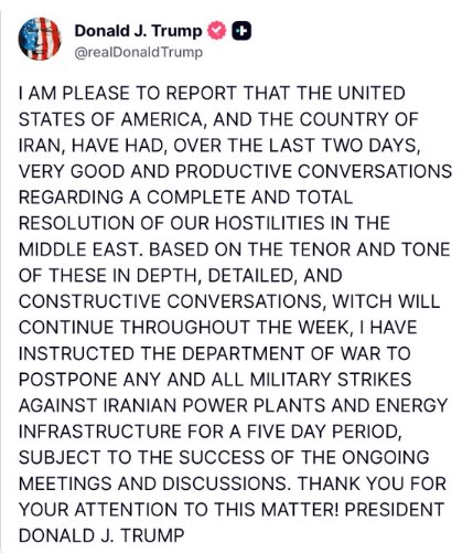 ਟਰੰਪ ਨੇ ਆਪਣੀ ਟਰੂਥ ਸੋਸ਼ਲ ਮੀਡੀਆ ਪੋਸਟ ‘ਤੇ ਲਿਖਿਆ, “ਮੈਨੂੰ ਇਹ ਦੱਸਦਿਆਂ ਖੁਸ਼ੀ ਹੋ ਰਹੀ ਹੈ ਕਿ ਅਮਰੀਕਾ ਅਤੇ ਈਰਾਨ ਨੇ ਪਿਛਲੇ ਦੋ ਦਿਨਾਂ ਵਿੱਚ ਮੱਧ ਪੂਰਬ ਵਿੱਚ ਸਾਡੀਆਂ ਦੁਸ਼ਮਣੀਆਂ ਦੇ ਸੰਪੂਰਨ ਅਤੇ ਵਿਆਪਕ ਹੱਲ ਬਾਰੇ ਬਹੁਤ ਵਧੀਆ ਅਤੇ ਲਾਭਕਾਰੀ ਚਰਚਾਵਾਂ ਕੀਤੀਆਂ ਹਨ। ਇਨ੍ਹਾਂ ਤੀਬਰ, ਵਿਸਤ੍ਰਿਤ ਅਤੇ ਰਚਨਾਤਮਕ ਚਰਚਾਵਾਂ ਦੇ ਸੁਰ ਅਤੇ ਮਿਆਦ ਦੇ ਆਧਾਰ ‘ਤੇ, ਮੈਂ ਯੁੱਧ ਵਿਭਾਗ ਨੂੰ ਈਰਾਨੀ ਪਾਵਰ ਪਲਾਂਟਾਂ ਅਤੇ ਊਰਜਾ ਬੁਨਿਆਦੀ ਢਾਂਚੇ ਵਿਰੁੱਧ ਕਿਸੇ ਵੀ ਅਤੇ ਸਾਰੇ ਫੌਜੀ ਹਮਲੇ ਨੂੰ ਪੰਜ ਦਿਨਾਂ ਦੀ ਮਿਆਦ ਲਈ ਮੁਅੱਤਲ ਕਰਨ ਦਾ ਨਿਰਦੇਸ਼ ਦਿੱਤਾ ਹੈ। ਇਹ ਗੱਲਬਾਤ ਹਫ਼ਤੇ ਭਰ ਜਾਰੀ ਰਹੇਗੀ। ਇਹ ਵਿਰਾਮ ਈਰਾਨ ਨਾਲ ਚੱਲ ਰਹੀਆਂ ਮੀਟਿੰਗਾਂ ਅਤੇ ਚਰਚਾਵਾਂ ਦੀ ਸਫਲਤਾ ‘ਤੇ ਨਿਰਭਰ ਕਰੇਗਾ। ਇਸ ਮਾਮਲੇ ਵੱਲ ਤੁਹਾਡੇ ਧਿਆਨ ਲਈ ਧੰਨਵਾਦ!”